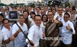Dirut Bank Mandiri Kartika Wirjoatmodjo (kedua kanan) didampingi Dirut Mandiri Sekuritas Silvano Rumantir (tengah) bersama jajaran direksi dan karyawan melakukan swafoto saat merayakan 18 Tahun Mandiri Sekuritas di Jakarta (31/7). (FOTO : Sigid Kurniawan/Antara)