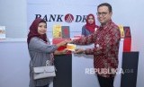 Pemimpin Grup Pengembangan Jaringan Bank DKI, Romy Wijayanto (kanan) menyerahkan buku tabungan kepada nasabag usai peresmian kantor kas Bank DKI di Unit Pollyanna Pajak dan Retribusi Daerah (UPPRD) Cipayung di Jakarta, (31/07). (FOTO : Dok Bank DKI )