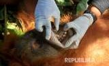 Seekor orangutan sumatra (Pongo abelii) diperiksa saat dilakukan proses evakuasi oleh petugas Yayasan Ekosistem Lestari-Sumatran Orangutan Conservation Programme (YEL-SOCP) dan BKSDA Aceh di Desa Geulagang Gajah, Kuala Bate, Aceh Barat Daya, Aceh, Jumat (3/8). (FOTO : Antara/Syifa Yulinnas)
