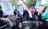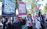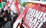 Puluhan massa yang tergabung dalam Aliansi Masyarakat Selamatkan Al-Aqsha (AMSA) menggelar aksi di depan Gedung Sate, Kota Bandung, Jumat (3/8). (FOTO : Republika/Edi Yusuf)