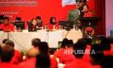 Ketua Umum PDIP Megawati Soekarnoputri (tengah) bersama Sekjen PDIP Hasto Kristiyanto dan pejabat terkait menghadiri pembekalan kepada Bacaleg DPR RI di Jakarta, Ahad (5/8). (FOTO : Republika/Mahmud Muhyidin)