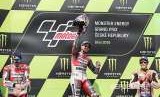 Andrea Dovizioso (tengah) dari tim Lenovo Ducati, merayakan kemenagannya di podium bersama Marc Marquez (kanan) dan Jorge Lorenzo (kiri) di Sirkuit Masaryk, Brno. (FOTO : Martin Divisek/EPA-EFE)