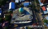 Foto aerial masjid yang rusak di Pemenang, Lombok Utara, NTB, Senin (6/8). (FOTO : Antara/Zabur Karuru)