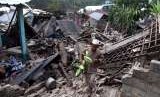 Warga mencari barang berharga miliknya di antara reruntuhan rumahnya yang rusak akibat gempa bumi, Tanjung, Lombok Utara, NTB, Senin (6/8). (FOTO : Antara/Zabur Karuru)