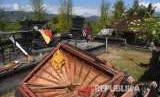 Warga merapikan kain yang terdapat di Pura Lingsar Bebengan yang rusak akibat gempa bumi, Tanjung, Lombok Utara, NTB, Senin (6/8). (FOTO : Antara/Zabur Karuru)