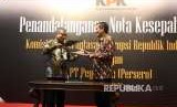 Direktur Utama PT Pegadaian (Persero) Sunarso (kiri) menyerahkan penandatanganan nota kesepahaman kepada Deputi Pencegahan KPK Pahala Nainggolan (kanan) di Kantor Pusat Pegadaian, Jakarta, Senin (6/8). Pada penandatanganan tesebut PT Pegadaian (persero) dan Komisi Pemberantasan Korupsi (KPK) bekerja sama untuk mencegah para pejabat dan karyawannya dalam upaya gratifikasi serta untuk memastikan penerapan prinsip Good Corporate Governance (GCG) dengan baik. (FOTO : Mahmud Muhyidin)