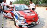 Executive General Manager PT Toyota-Astra Motor (TAM) Fransiscus Soerjopranoto (kiri) berbincang dengan dua pebalap slalom Toyota Team Indonesia (TTI) Dimas Agil (kanan) dan Anjasara Wahyu (tengah) di samping mobil Toyota Etios pada acara Media Gathering di Gaikindo Indonesia International Auto Show (GIIAS) di ICE BSD, Serpong, Tangerang, Banten, Senin (6/8). (FOTO : Muhammad Iqbal/Antara)