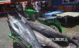 Pedagang membawa ikan marlin di Tempat Pelelangan Ikan (TPI) Desa Ujong Baroh, Johan Pahlawan, Aceh Barat, Aceh, Senin (6/8). Ikan marlin tangkapan nelayan di kawasan itu dijual Rp25.000 sampai Rp35.000 per kilogram yang digunakan sebagai bahan baku pembuatan bakso dan ikan asin. (FOTO : Syifa Yulinas/Antara)