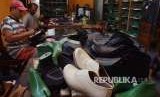 Perajin membuat sepatu kulit di industri rumahan di Kabupaten Magetan, Jawa Timur, Senin (6/8). Industri rumahan tersebut mampu memproduksi rata-rata 60 pasang sepatu per hari dan dijual dengan harga antara Rp100 ribu hingga Rp500 ribu per pasang. (FOTO : Siswowidodo/Antara)