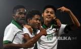 Pesepak bola Indonesia U-16 Amirudin Bagus Kahfi Alfikri (tengah) bersama rekannya Rendy Juliansyah (kanan) dan Muhammad Talaohu (kiri) melakukan selebrasi usai mencetak gol ke gawang Kamboja U-16 dalam laga penyisihan grup A piala AFF U-16 di Stadion Gelora Delta Sidoarjo, Jawa Timur, Senin (6/8). (FOTO : Antara/M Risyal Hidayat)