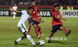 Pesepak bola Indonesia U-16 Muhammad Fajar Fathur Rachman (kiri) berusaha menendang bola dibayangi pesepak bola Kamboja U-16 Chhim Pichponioeu (kanan) dalam laga penyisihan grup A Piala AFF U-16 di Stadion Gelora Delta Sidoarjo, Jawa Timur, Senin (8/6). Indonesia U-16 menang dengan skor 4-0. (FOTO : M Risyal Hidayat/Antara)