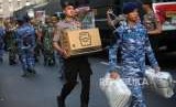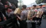 Petugas mengangkut bantuan logistik untuk pengiriman bantuan kemanusian peduli bencana gempa di Lombok, Nusa Tenggara barat di Mapolda Metro Jaya, Jakarta, Rabu (8/8). (FOTO : Republika/Mahmud Muhyidin)