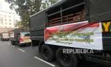 Petugas membawa truk logistik untuk pengiriman bantuan kemanusian peduli bencana gempa di Lombok, Nusa Tenggara barat di Mapolda Metro Jaya, Jakarta, Rabu (8/8). (FOTO : Republika/Mahmud Muhyidin)