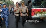 Kapolda Metro Jaya Irjen Pol Idham Azis (tengah) didampingi petinggi Lanud Halim Perdanakusuma dan Kodam Jaya meninjau truk logistik untuk pengiriman bantuan kemanusian peduli bencana gempa di Lombok, Nusa Tenggara barat di Mapolda Metro Jaya, Jakarta, Rabu (8/8). (FOTO : Republika/Mahmud Muhyidin)