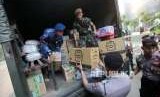 Petugas mengangkut bantuan logistik kedalam truk untuk pengiriman bantuan kemanusian peduli bencana gempa di Lombok, Nusa Tenggara barat di Mapolda Metro Jaya, Jakarta, Rabu (8/8). (FOTO : Republika/Mahmud Muhyidin)