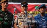 Kapolda Metro Jaya Irjen Pol Idham Azis (tengah) didampingi petinggi Lanud Halim Perdanakusuma dan Kodam Jaya memberikan keterangan kepada media seusai apel untuk pengiriman bantuan kemanusian peduli bencana gempa di Lombok, Nusa Tenggara barat di Mapolda Metro Jaya, Jakarta, Rabu (8/8). (FOTO : Republika/Mahmud Muhyidin)