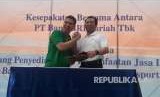 Direktur Bisnis Ritel PT Bank BRI Syariah Tbk. Widodo Januarso, (kanan) dan Managing Director Grab Indonesia Ridzki Kramadibrata menandatangani MoU kerja sama penyaluran fasilitas Pembiayaan Faedah Mikro bagi UMKM kuliner yang tergabung dalam rekanan Grab Food di Geldboom Food Plaza Surabaya, Kamis (9/8). (FOTO : Dadang Kurnia/Republika)