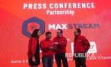 Head Marketing & Communication Asia beIN Magdalene Ng, Vice President Brand and Communications Telkomsel Nirwan Lesmana, Head Of Digital Lifestyle Crispin Tristram dan Deputy Chief Executive Officer (CEO) Kapan Lagi Youniverse, Emtek Group, Karaniya Dharmasaputra saat peluncuran konten aplikasi video digital MAXstream di Jakarta, (9/8). (FOTO : Yogi Ardhi/Republika)