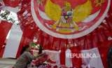 Penjual merapikan bendera dan umbul-umbul di Makassar, Sulawesi Selatan, Kamis (9/8). Bendera dan pernak-pernik bernuansa Merah Putih itu dijual Rp5.000 hingga Rp300 ribu per lembar. (FOTO : Yusran Uccang/Antara)