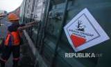 Petugas memeriksa segel gerbong yang berisi limbah B3 (Bahan Berbahaya Beracun) di Stasiun Kalimas, Surabaya, Jawa Timur, Kamis (9/8). PT Kereta Api Indonesia (KAI) melalui PT Kereta Api Logistik (Kalog) bekerja sama dengan PT Prasadha Pamunah Limbah Industri (PPLI) meluncurkan angkutan limbah B3 (Bahan Berbahaya Beracun) dari Stasiun Kalimas Surabaya ke Stasiun Nambo Bogor yang menjadi layanan pertama dan satu-satunya di Indonesia. (FOTO : Didik Suhartono/Antara)