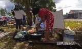Seorang pengungsi korban gempa bumi mencuci pakaian mengunakan air dari parit di dekat tempat pengungsian di Desa Santong, Kayangan, Lombok Utara, NTB, Sabtu (11/8). (FOTO : Zabur Karuru/Antara)