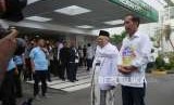Calon presiden petahana Joko Widodo bersama calon wakil presiden KH. Ma'ruf Amin tiba di RSPAD Gatot Soebroto untuk melakukan sesi pemeriksaan kesehatan di RSPAD Gatot Soebroto, Jakarta, Ahad (12/8). (FOTO : Republika/Edwin Dwi Putranto)
