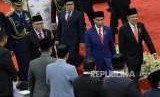 Presiden Joko Widodo didampingi Wakil Presiden Jusuf Kalla dan Ketua MPR Zulkifli Hasan berjalan seusai menghadiri Sidang Tahunan MPR Tahun 2018 di Kompleks Parlemen, Senayan, Jakarta, Rabu (16/8). (FOTO : Republika/Prayogi)