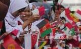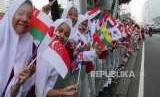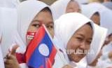 Pelajar mengibarkan bendera negara-negara peserta Asian Games 2018 saat menanti pawai obor (Torch Relay) Asian Games yang akan melintas di jalan Medan Merdeka Barat Jakarta (16/8). (FOTO : Darmawan / Republika)