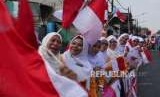 Warga mengibarkan bendera merah putih dan bendera negara-negara peserta Asian Games 2018 saat menanti pawai obor (Torch Relay) Asian Games yang akan melintas di sekitar Utan Panjang, Jakarta (16/8). (FOTO : Darmawan / Republika)