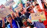 Warga membawa poster pada acara “arak-arakan” (karnaval tradisional) memperingati hari Kemerdekaan ke-73 Republik Indonesia di wilayah Kecamatan Pasirjambu, Kabupaten Bandung, Sabtu (18/8). (FOTO : Republika )