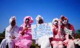 Dua wanita memerankan adegan ring tinju saat mengikuti “arak-arakan” (karnaval tradisional) memperingati hari Kemerdekaan ke-73 Republik Indonesia di wilayah Kecamatan Pasirjambu, Kabupaten Bandung, Sabtu (18/8). (FOTO : Republika )