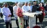 Disaksikan Dirut Bank BJB Ahmad Irfan (berpeci) dan sejumlah pejabat lainnya, Pj Gubernur Jawa Barat M Iriawan secara simbolis menekan tombol undian hadiah penghargaan untuk nasabah setia Aparatul Sipil Negara (ASN) Provinsi Jawa Barat program Consumer Loan Loyalty Program (CLLP) 2018 dalam rangka memperingati Hari Ulang Tahun (HUT) Provinsi Jawa Barat ke-73, di Gasibu, Kota Bandung, Ahad (19/8). (FOTO : Edi Yusuf/Republika)