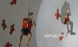 Emas Dari Panjat Dinding. Pemanjat Dinding Indonesia Aries Susanti Rahayu saat bertanding pada cabang panjat dinding nomor kecepatan putri Asian Games 2018 di Komplek Olahraga Jakabaring, Kamis (23/8) malam. (FOTO : Republika/ Wihdan)
