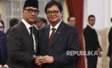 Menteri Perindustrian Airlangga Hartarto (kanan) memberikan ucapan selamat kepada Menteri Sosial Agus Gumiwang Kartasasmita (kiri) saat acara pelantikan di Istana Negara, Jakarta, Jumat (24/8). (FOTO : Antara/Hafidz Mubarak A)