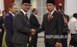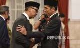 Presiden Joko Widodo (kanan) memberikan ucapan selamat kepada Menteri Sosial Agus Gumiwang Kartasasmita (kiri) seusai acara pelantikan di Istana Negara, Jakarta, Jumat (24/8). (FOTO : Antara/Hafidz Mubarak A)
