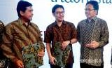 Direktur Sales Telkomsel Sukardi Silalahi (kanan) dan Vice President Sales and Service Strategy Gilang Prasetya (tengah) berbincang dengan Ketua Tim Pelaksana Visit Wonderful Indonesia Hariyadi BS Sukamdani usai penandatanganan Memorandum of Understanding (MoU) Telkomsel sebagai telco co-branding partner dengan Tim Pelaksana ‘Visit Wonderful Indonesia’, di Jakarta, Jumat (24/8). (FOTO : Audy Alwi/Antara)