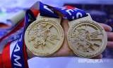 Karyawan menunjukkan replika medali emas sebagai suvenir yang dijual di Super Store Asian Games ke-18 Tahun 2018 di Zona Bhin-Bhin, Komplek Olahraga Gelora Bung Karno, Senayan, Jakarta, Jumat (24/8). Super Store tersebut menjual berbagai macam suvenir resmi Asian Games 2018 seperti boneka maskot Bhin-Bhin, Atung dan Kaka, gantungan kunci, jaket, replika medali dan lainnya yang dibanderol dengan harga mulai dari Rp1.500 hingga Rp5 juta. (FOTO : Widodo S Jusuf/Antara/INASGOC)