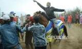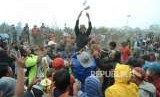 Pemilik kuda yang menang dalam pertandingan memberikan saweran pada penonton sebabagai tanda syukur pada Kejuaraan Pacuan Kuda Tradisional oleh Komunitas Kuda Tradisional (KKT) Bandung Barat dan Podasi Jawa Barat, di lapangan pacuan kuda, Desa Kayuambon, Kecamatan Lembang, Kabupaten Bandung Barat, Ahad (26/8). (FOTO : Republika/Edi Yusuf)