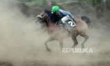 Seorang joki memacu kudanya pada Kejuaraan Pacuan Kuda Tradisional oleh Komunitas Kuda Tradisional (KKT) Bandung Barat dan Podasi Jawa Barat, di lapangan pacuan kuda, Desa Kayuambon, Kecamatan Lembang, Kabupaten Bandung Barat, Ahad (26/8). (FOTO : Republika/Edi Yusuf)
