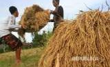 Petani mengangkut padi saat panen di area persawahan Desa Pasi Jambu, Kecamatan Kaway XVI, Aceh Barat, Aceh, Senin (27/8). Menurut petani setempat, produksi padi pada musim panen tahun ini rata-rata turun sekitar 40 persen dari musim panen sebelumnya akibat pengaruh musim kemarau. (FOTO : Sifa Yullinas/Antara)