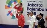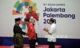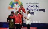 Presiden Joko Widodo (kiri) bersama Ketua Umum Pengurus Besar Ikatan Pencak Silat Seluruh Indonesia Prabowo Subianto (kedua kiri) usai memberikan medali kepada pesilat Indonesia Wewey Wita usai pertandingan cabang olahraga silat Asian Games 2018 di Padepokan Pencak Silat TMII, Jakarta, Rabu (29/8). (FOTO : Republika/Putra M. Akbar)