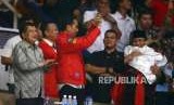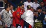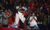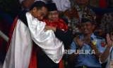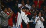 REPUBLIKA.CO.ID, JAKARTA -- Ada momen menarik yang terjadi di venue pencak silat, Rabu (29/8), salah satu atlet pencak silat Hanifan Yudani Kusuma membuat Prabowo dan Joko Widodo berpelukan. Momen langka itu terjadi ketika Hanifan, peraih emas pada partai final nomor kelas C putra, memeluk satu per satu tokoh yang hadir, mulai dari Ketua Kontingen (Cdm) Indonesia Asian Games 2018 Syafruddin, Megawati Soekarnoputri, Jusuf Kalla, Joko Widodo, dan Prabowo.