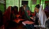 Anak-anak pengungsi membaca Quran di salah satu madrasah di kamp pengungsian Kutupalong, Bangladesh. (FOTO : Altaf Qadri/AP)