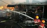 Pertugas pemadam kebakaran berusaha memadamkan api yang menghanguskan Pasar Gedebage, Kota Bandung, Senin (3/9). (FOTO : Republika/Edi Yusuf)