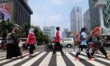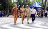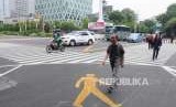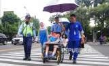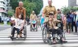REPUBLIKA.CO.ID, JAKARTA -- Gubernur DKI Jakarta Anies Baswedan bersama Direktur Utama PT Transportasi Jakarta Budi Kaliwono mengantarkan penyandang disabilitas menyeberangi pelican crossing di Jalan MH Thamrin, Jakarta Pusat, Selasa (4/9).