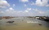 Berbagai jenis transportasi air berlayar di aliran Sungai Musi, Palembang, Sumatra Selata. (FOTO : Wihdan Hidayat/Republika)