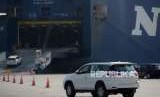 Mobil bermerek toyota yang akan ekspor bersiap menaiiki kapal saat berlangsungnya acara Ralisasi 1 Juta Unit Ekspor CBU di Tanjung Priok Car Terminal Jakarta, Rabu (5/9). (FOTO : Republika/Prayogi)