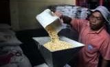 Pengrajin menggiling kedelai impor sebelum diolah menjadi tempe di gudang Koperasi Pengrajin Tahu Tempe Sanan, Malang, Jawa Timur, Rabu (5/9). (FOTO : Antara/Ari Bowo Sucipto)