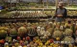 Pekerja menyiram tanaman kaktus (Cactaceae) di tempat budidaya kaktus, Bandung, Jawa Barat, Jumat (7/9). Budidaya kastus ini dimulai sejak tahun 1974 dan menghasilkan ribuan jenis kaktus serta dijual dengan harga kisaran Rp5 ribu - Rp15 juta per kaktus tergantung jenis kaktusnya. (FOTO : M Ibnu Chazar/Antara)