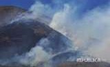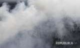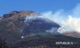 Asap mengepul dari kebakaran hutan gunung Sindoro difoto dari Desa Sigedang, Kejajar, Wonosobo, Tengah, Sabtu (8/9). Kebakaran sejak Jumat (7/9) siang tersebut terjadi di lahan hutan dan ilalang yang berada pada petak 7B area Perhutani KPH Kedu Utara. (FOTO : Nova Wahyudi/Antara)